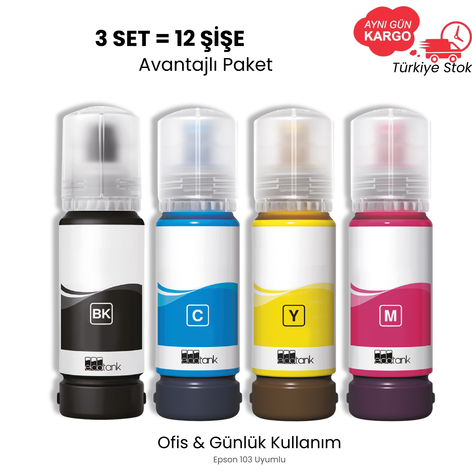 Bu paket Epson 103 serisi kullanan yazıcılar için özel hazırlanmıştır. Toplam 12 şişe (3 set) içerir. Günlük baskı ihtiyacı olan kullanıcılar ve ofis ortamları için ideal ekonomik çözümdür. Tekli alıma göre daha avantajlı birim maliyet sunar ve uzun süreli kullanım sağlar.